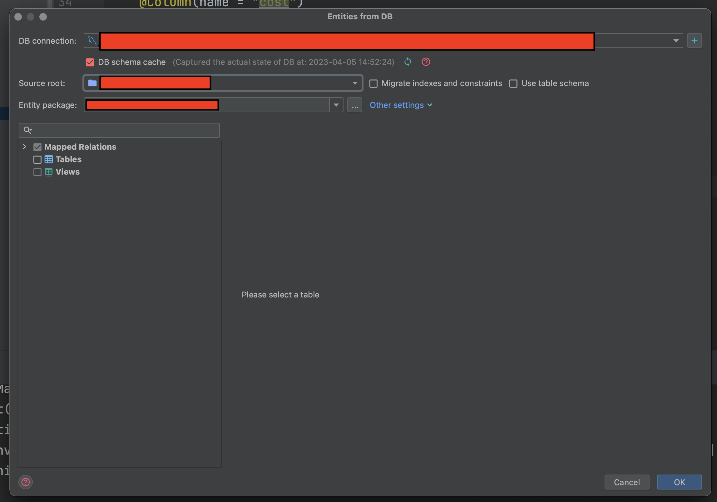 왼쪽 탭의 Tables 체크박스를 눌러서 테이블을 선택한다음에 OK를 누르면 자동으로 엔티티 클래스로 변환이 됩니다.